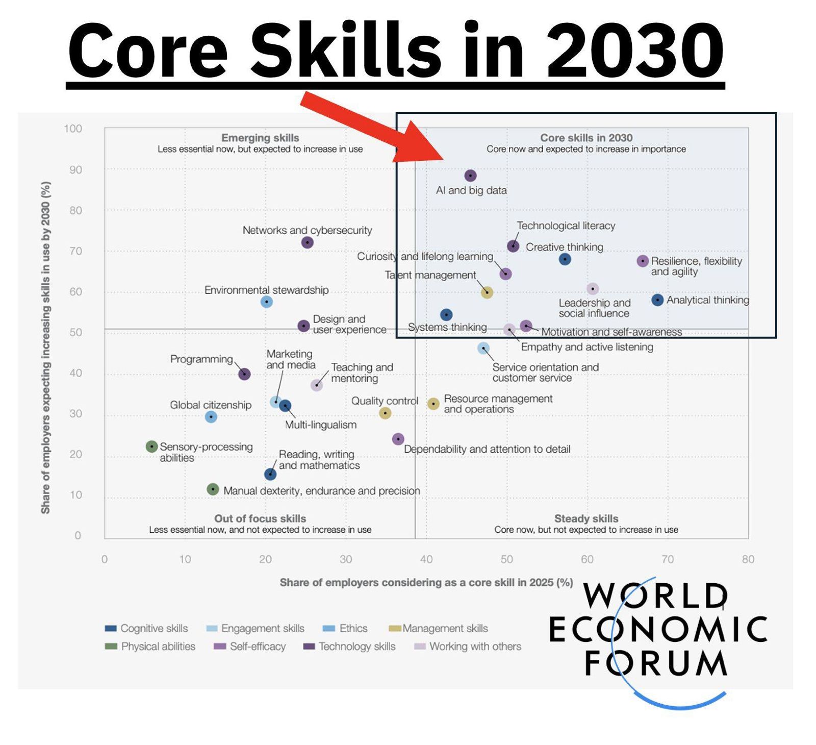 - Kuadran Atas Kanan (Kemahiran Teras pada 2030): Kemahiran-kemahiran ini penting sekarang dan dijangka menjadi lebih penting pada masa hadapan. Contohnya termasuk “AI dan data besar”, “celik teknologi”, “pemikiran kreatif”, dan “ketahanan, fleksibiliti dan ketangkasan”.